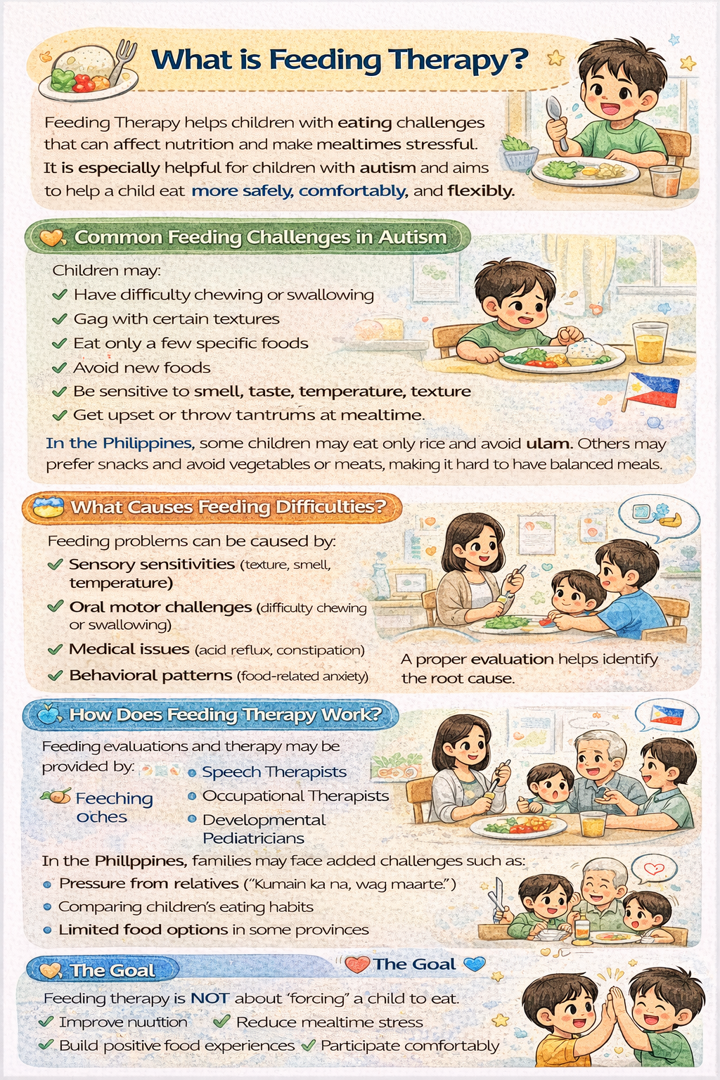 In the Philippines, feeding therapy may be offered in therapy centers, hospitals, or developmental pediatric clinics. Because access can vary, parents play a big role at home. Helpful tips include offering small amounts of new food beside familiar food, keeping mealtimes calm, avoiding pressure or shaming, and celebrating small progress. If mealtimes are consistently stressful or your child’s nutrition and growth are affected, it may be more than “picky eater lang.” Speaking with a pediatrician or therapist can help guide the next steps. 💙