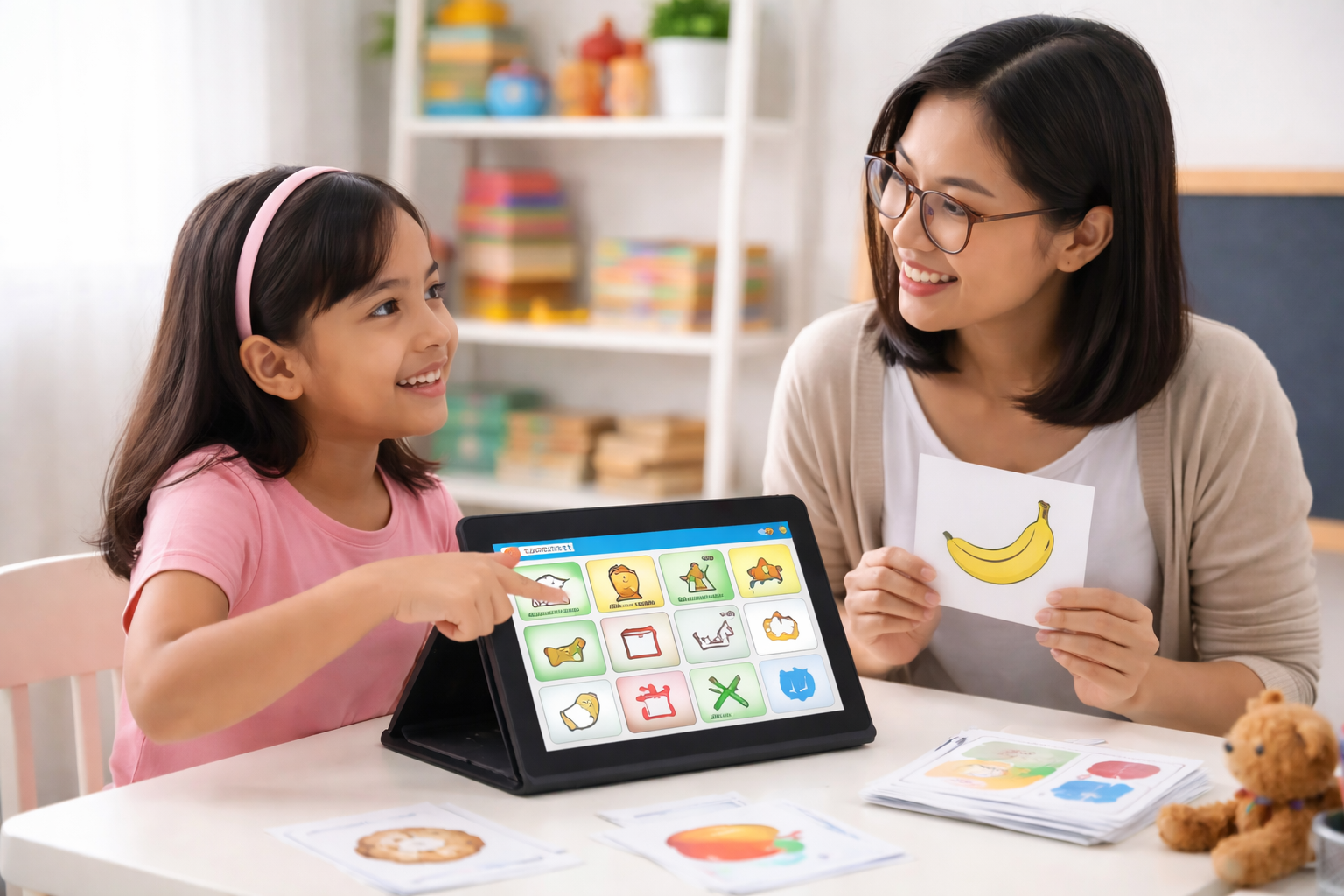 Speech-language therapy helps children improve how they communicate and understand others. Some children with autism may not speak or may have limited speech, while others can talk but struggle with conversations, social cues, or understanding what others mean. A Speech-Language Pathologist (SLP) evaluates the child’s strengths and challenges, then creates goals to improve speaking, listening, and social communication skills.